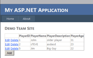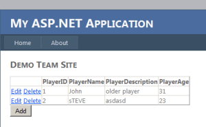 Ok so this is pretty simple, just two main controls. First of all the datasource. This is the object datasource for the page and all we specify is the type (or class) it is using for this datasource and then specifies the Type, the methods (edit and delete) and the parameters. The other control is the good old Gridview and as you can see we just ensure it specifies AutoPaging, AutogenerateColumns and the datakey (we need this so that the delete command can use the PlayerID to delete).